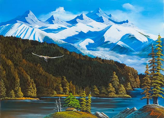 わしが飛ぶ雄大なロッキー山脈の風景です。