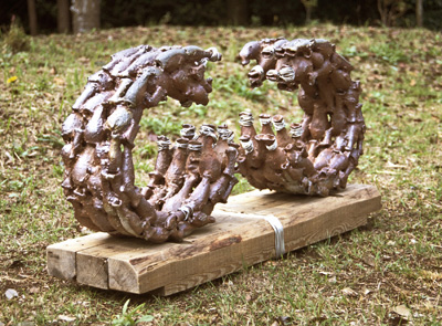 "Confrontation," (w)97.0 -(d)25.0 - (h)51.0 cm, wheel-thrown stoneware with slip, wire, and wood addition, traditional way fired to 1300 degrees C. in oxidized atmosphere, ten-day firing. Included in " The Ceramic Desigin Book, A Gallery of Contemporary Work"- 1998, Lark Books, 67 Broadway Asheville, NC 28801, U.S.A.