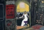 お洒落なお店の中でピアノを弾いている女性を、作家特有のコントラスト淡いやさしいタッチで