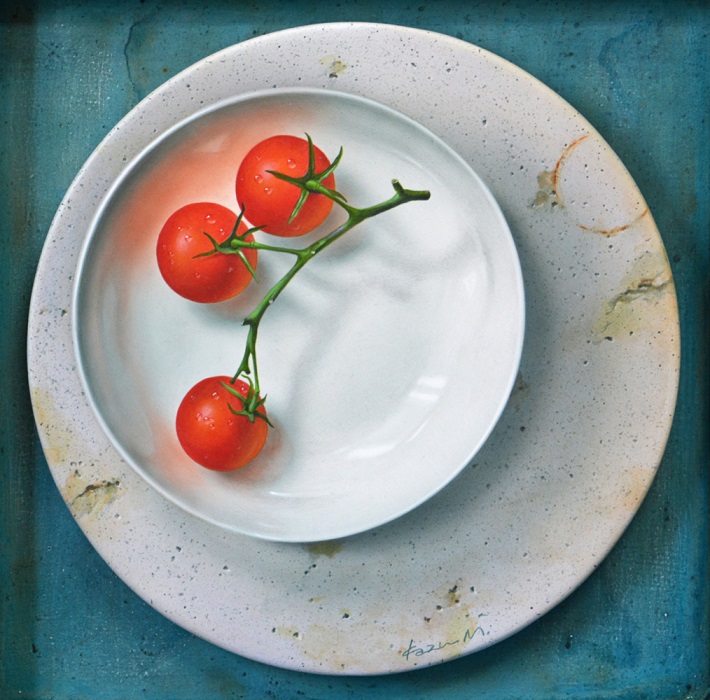 丸いパネルに丸い皿、そこにあるように描いた、トリックアート的な効果と、円や球で構成する自分の作風を意識して描いた静物画です。