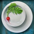 丸いパネルに丸い皿、そこにあるように描いた、トリックアート的な効果と、円や球で構成する自分の作風を意識して描いた静物画です。
